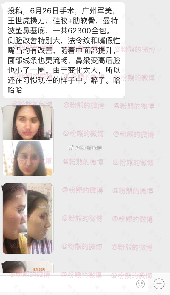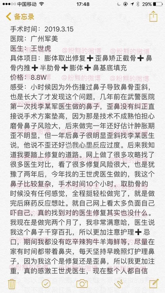 粉熊的微博一鼻整形投稿2019年3.15日,广州军美医疗整形医院,王世虎医生,鼻子修复鼻综合手术,具体项目:膨体取出修复➕歪鼻矫正截骨➕鼻骨内推➕半肋骨➕进口膨体➕鼻基底填充,费用88000。微博投稿一一鼻整形隆鼻