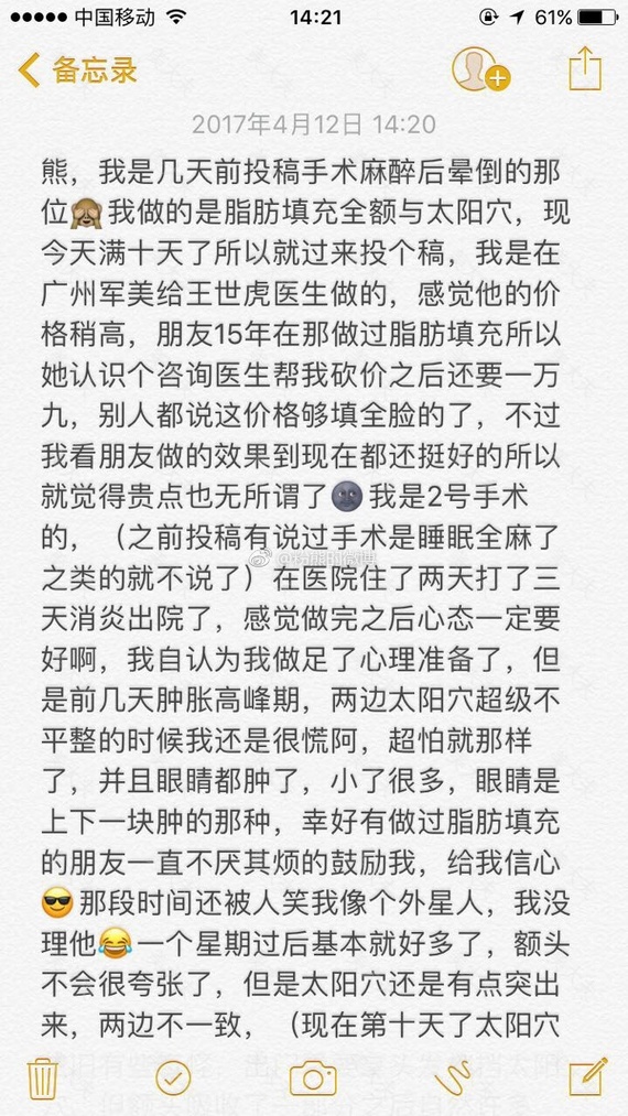 #微博投稿一一脂肪填充#4月2日在广州军美王世虎医生处做的自体脂肪填充太阳穴、额头,价格一万九。