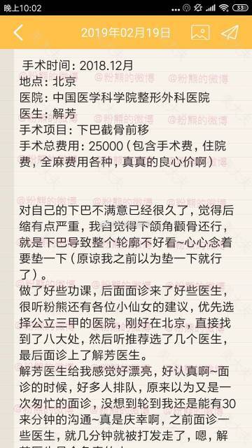#粉熊的微博一脸型投稿#2018.12月,北京中国医学科学院整形外科医院,解芳,下巴截骨前移,手术总费用:25000(包含手术费,住院费,全麻费用各种。