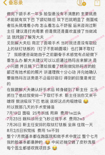 #粉熊的微博一脸型投稿#2017年11月1日和2018年11月1日分别在北京八大处医院解芳大夫出做了下颌骨手术和面部吸脂,费用35000+12800一共是47800元。面诊的时候还是多听医生的建议,不要按照自己的想法一意孤行,不太现实。