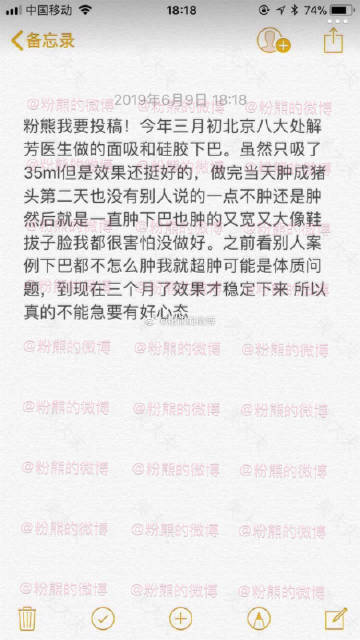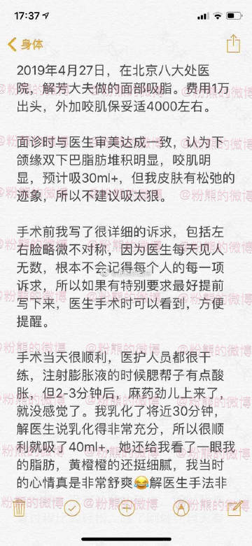 #粉熊的微博一吸脂投稿#2019年4月27日,北京八大处医院,解芳大夫做的面部吸脂。费用1万出头,外加咬肌保妥适4000左右。