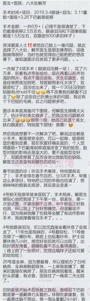 #粉熊的微博一脸型投稿#2019.3,北京八大处,解芳医生,眼袋+泪沟填充+切开重睑+下颌缘吸脂+下巴截骨前移,手术总金额6万+。