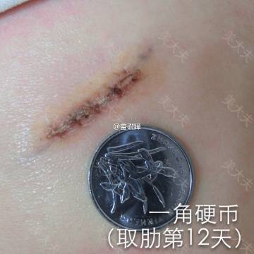 分享一下我取肋软骨处刀口的情况,和一角硬币相比起来刀口挺小,取肋处开口大小和医生技术、自身脂肪厚度(也就是你胖不胖)、还有需要软骨量有关。薛技术不错 我脂肪厚度小 且只取做鼻头支架的量 所以开口不大。图二李战强医生的全肋骨鼻取肋处相比李更胜一筹哦。另外就是取了肋骨没有疼痛感 不用担心