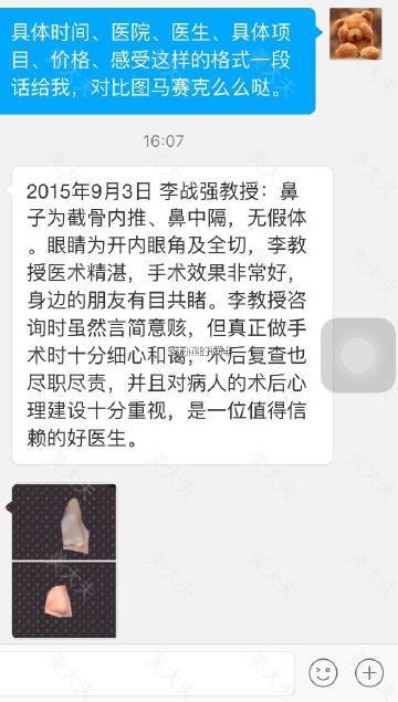 面诊李战强出来,如好大夫评论里的 看起来帅帅的 鼻子也特别高,说话温柔看起来和蔼可亲的,表示可以做半肋骨,但是对于能做出来什么鼻形他表达的意思就是他做成什么样就是什么样,虽然我也知道我的基础不好 但是lzq还是个人审美比较严重吧,另外真如大家说的 他会要求除了鼻子之外还要动其他的五官。