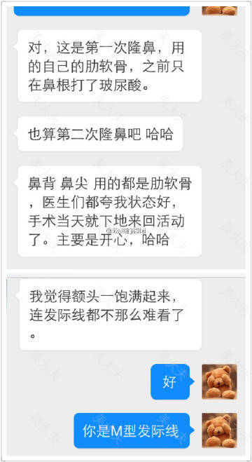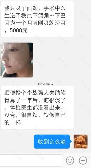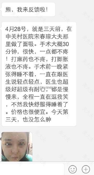 #微博投稿——面吸&鼻整形#4月28日在中关村医院宋春琼医生处那里做的面吸。手术大概30分钟,全程一直在逗我笑,不然快舒服得睡着了。只吸了面颊,送了下颌角,价格5000。图一术前,二三术后。顺便投个李战强医生肋软骨鼻子一年后,疤很淡了,体检医生都没看出来,没弯,很自然,就像自己的一样。