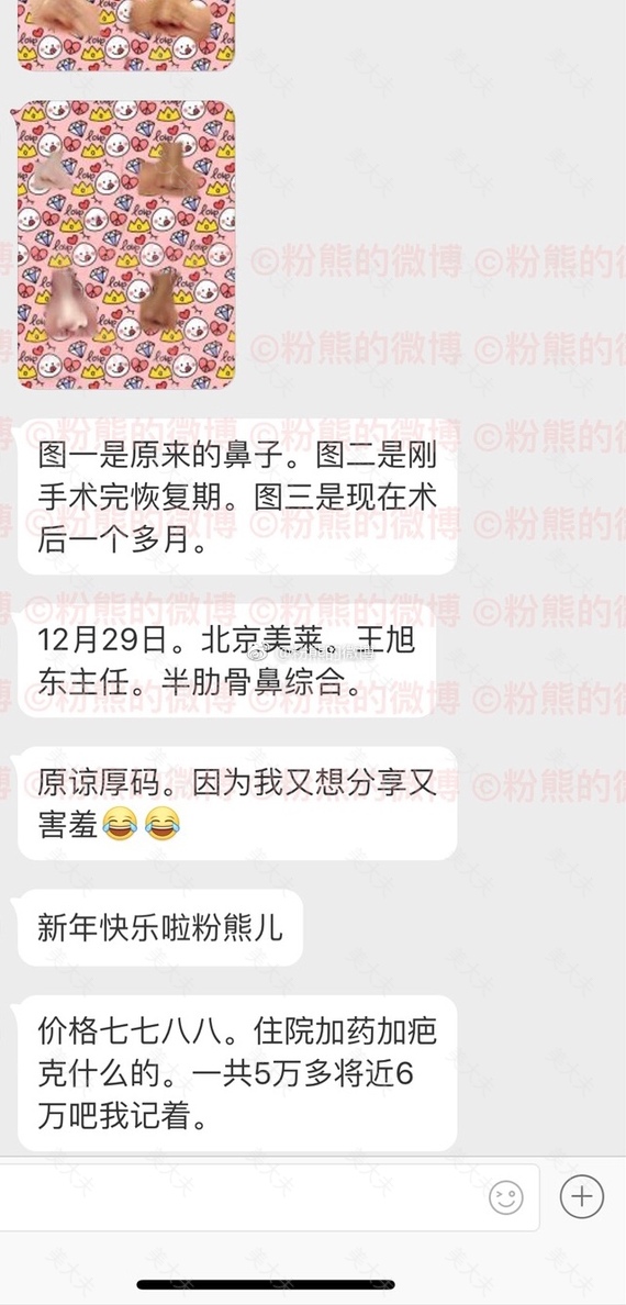 粉熊的微博一鼻整形投稿12月29日。北京美莱。王旭东主任。半肋骨鼻综合。6万左右