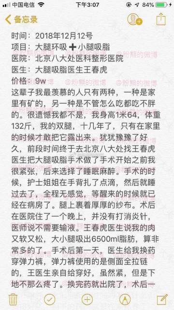 #粉熊的微博一吸脂投稿#2018年12月,北京八大处整形医院,王春虎,大小腿吸脂,价格9万左右。