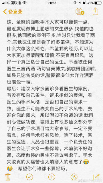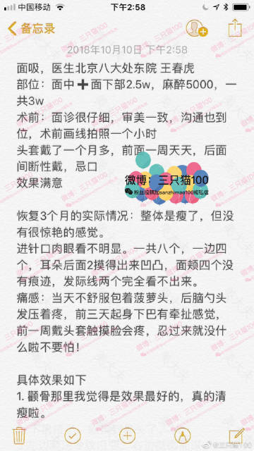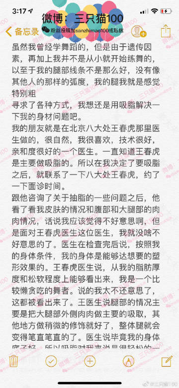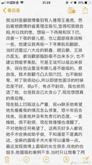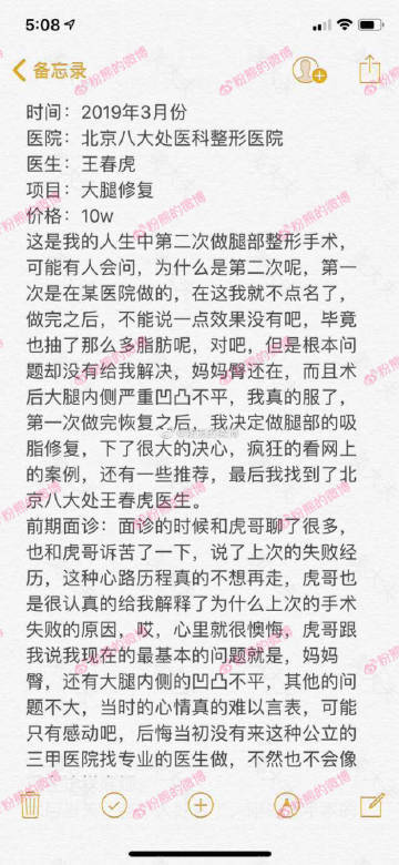 说一下八大处王春虎吧,他黑料实在太多了。当时找大腿吸脂医生的时候他是我比较心动的医生,16年的时候粉熊那里有很多他的案例,然后我就约了他的面诊… 真的是很玻璃心的一个医生了 我只不过没有当场要跟他手术 我走了以后立马把我踢出了他的患者交流群 然后过了一阵把我拉黑了 当时16年他双大腿只需要3w 然后一年不到 涨到了6w多… 当时李发成马桂娥这个级别的才8w左右 我也不知道他哪儿来的自信 之后这两年陆陆续续看到些他的失败案例 幸亏他把我拉黑了 让我避了个大雷