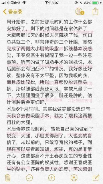 目前腿也没有凸凹不平,之前因为太胖脂肪堆积的那种凸凹不平吸脂后也没了,正常运动正常吃喝正常上班,所以能遇到技术一流审美一流的吸脂医生真的很幸运,超级感谢王医生!