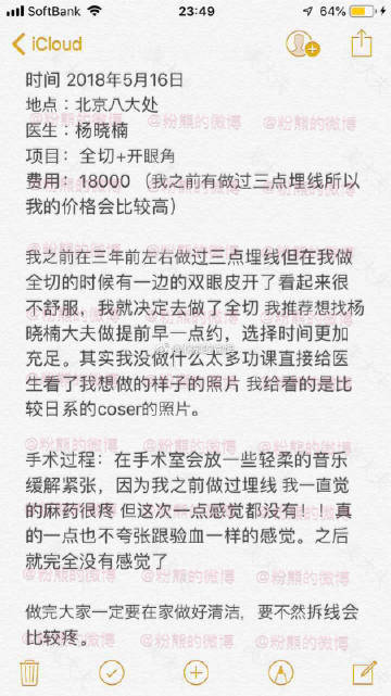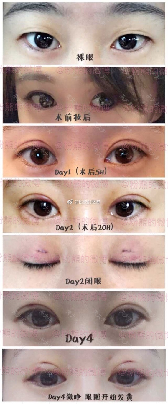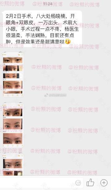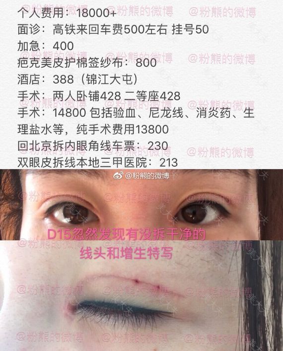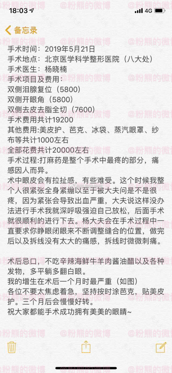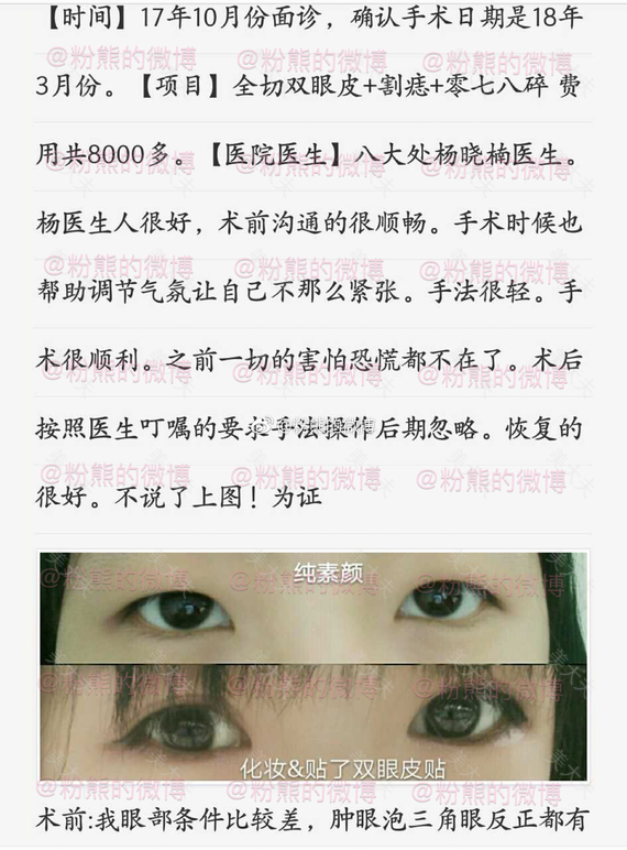 粉熊的微博一双眼皮投稿时间 2018年5月16日,北京八大处,杨晓楠,全切修复+开眼角,费用18000 (我之前有做过三点埋线所以我的价格会比较高)。