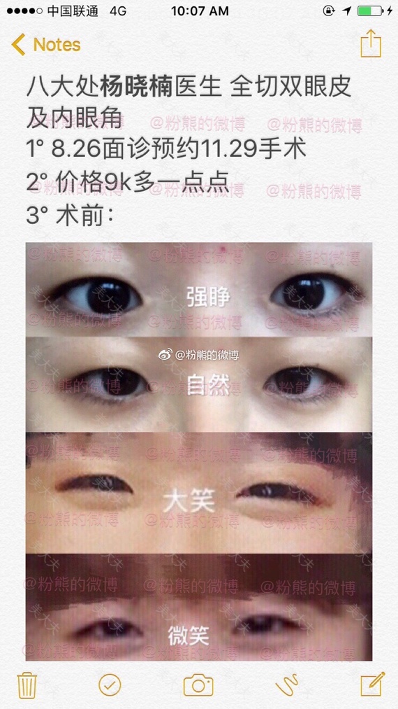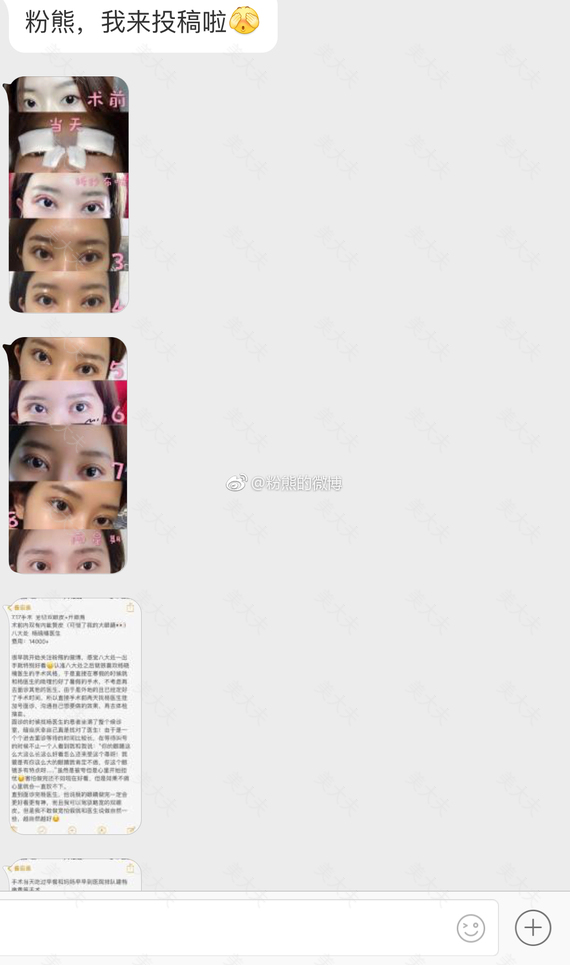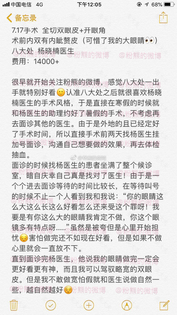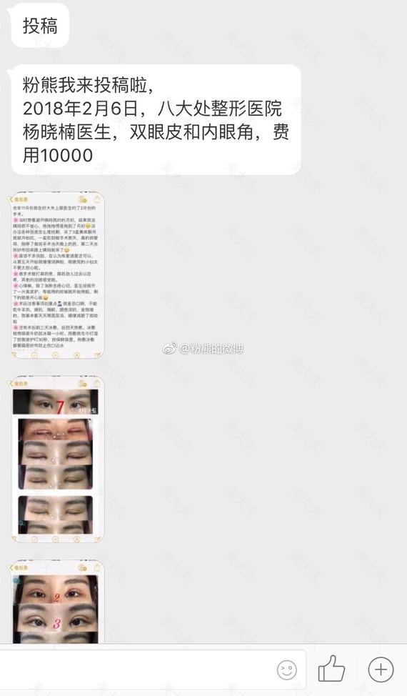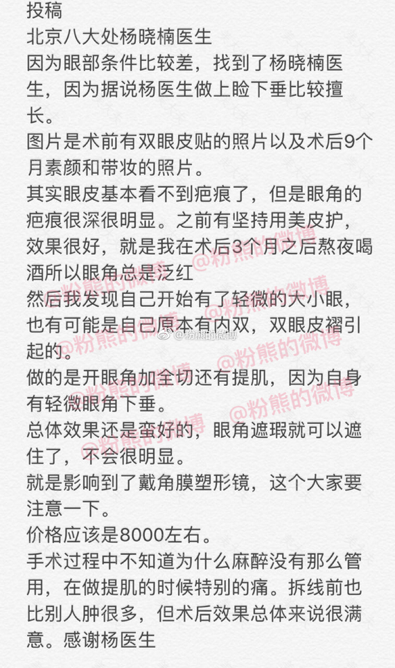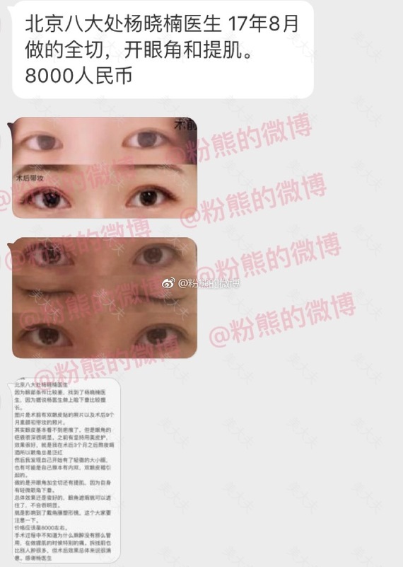 粉熊的微博一双眼皮投稿7.17,北京八大处,杨晓楠,全切双眼皮+开眼角,价格14000+。