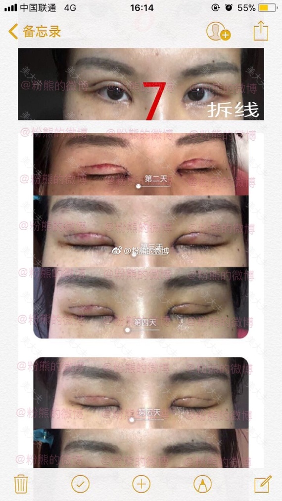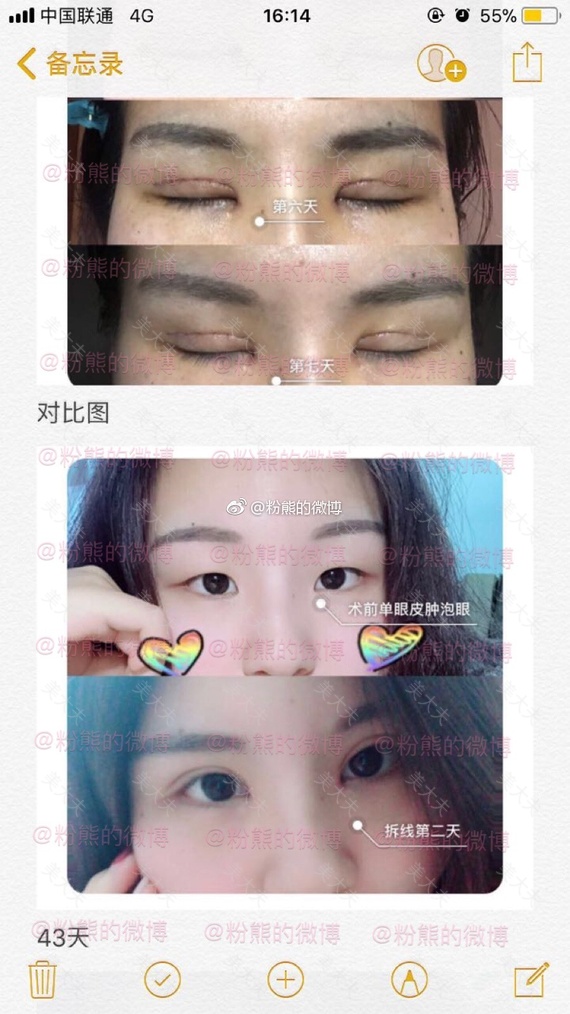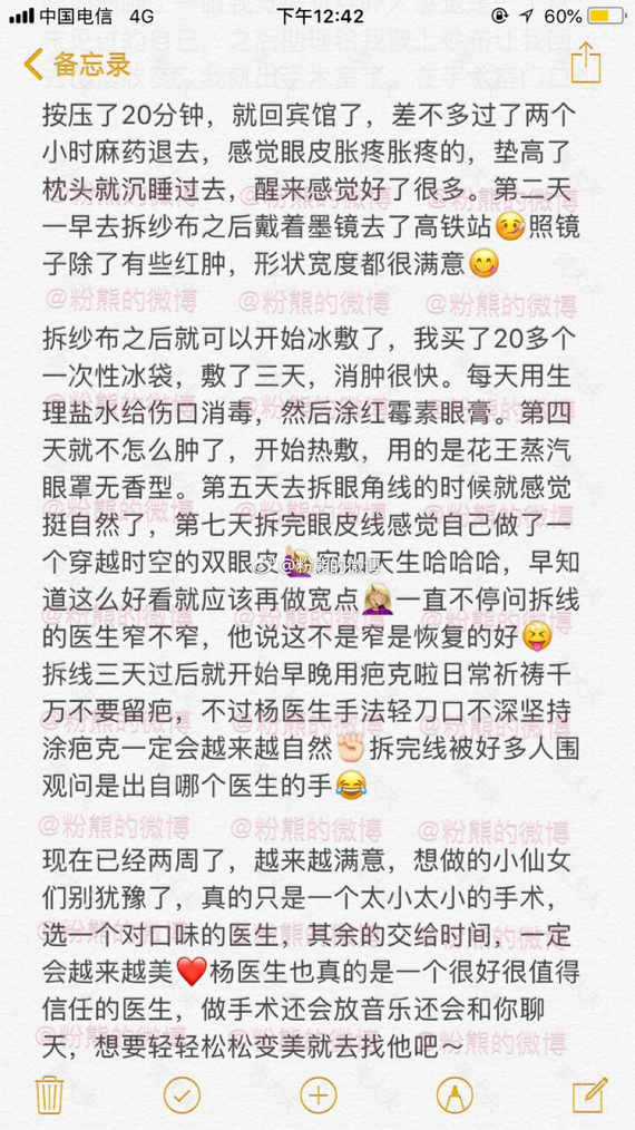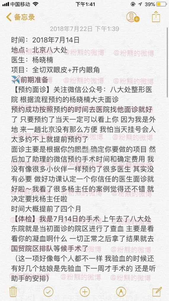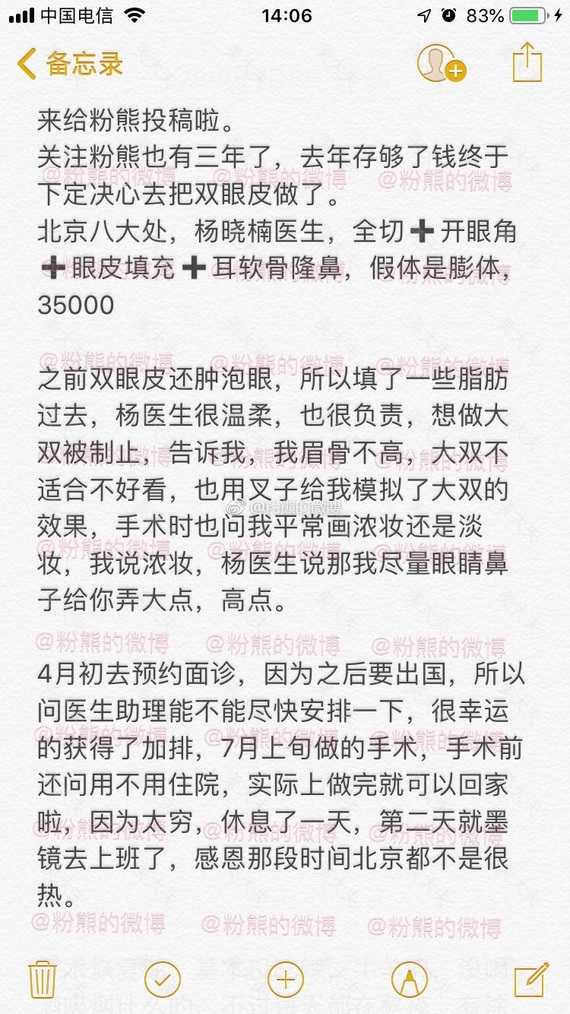 粉熊的微博一双眼皮投稿7.17,北京八大处,杨晓楠,全切双眼皮+开眼角,价格14000+。