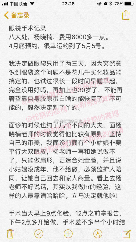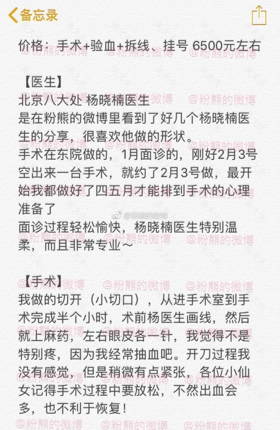 粉熊的微博一双眼皮投稿17年10月份面诊,确认手术日期是18年3月份,北京八大处,杨晓楠医生,全切双眼皮+割痣+零七八碎 费用共8000多。