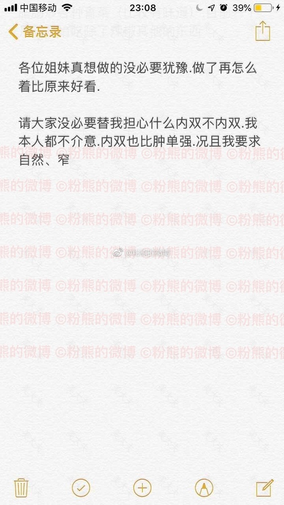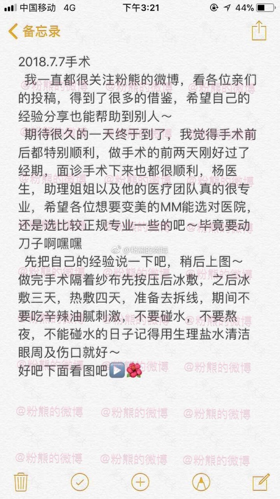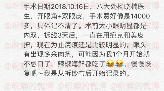 粉熊的微博一双眼皮投稿2018年10月20日手术,北京八大处,杨晓楠,国贸门诊,双眼皮+开眼角,手术费:14800。