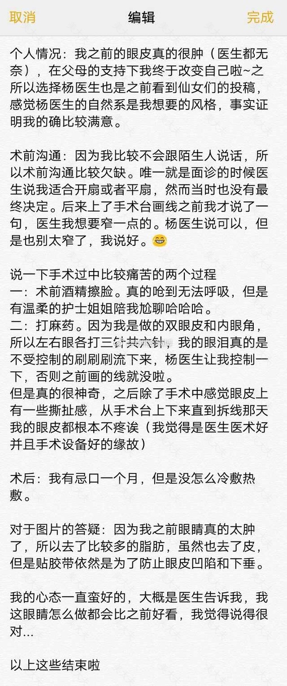首先非常感谢杨主任,辛苦了,严肃认真却又不失亲和力的医生,因为眼睛做过很多次都不对称,已经很失望了,没想到杨主任给我调好了,而且真的不为挣钱手术,当初面珍还说左眼没必要动,单侧修复就可以,单侧修复更难而且还便宜,很少有这样的医生了,只见过劝人多做的医生,这样有医德只为患者着想的真不多了!回家后果断约了杨主任手术!庆幸自己选对医生,手术中一直皱眉一直动眼珠子,非常影响手术可是我又控制不了,杨大夫都没有发脾气很有耐心的继续做,还有一个美女助理人也超好超好劝我别紧张,很温柔很有耐心的小美女,比心!换药拆线的男助理有点凶哦