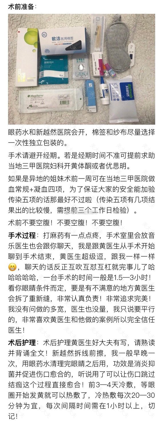 做完手术后,虽然眼睛有点痛 但还是能忍 毕竟你打麻药都忍过来了 之后就是冰敷 我买了很多很多的一次性冰敷戴 一有空就敷 过三天后热敷 买的是usb接口的眼罩!那个好点!有温度可以调!(在这打个广告,如果有妹子要的话可以➕我我便宜转转掉还有我让朋友从瑞典亲自人肉背回的美皮护大号 还剩好几张)不过不管冰敷还是热敷 最好在眼睛上盖层医用纱布 卫生点嘛