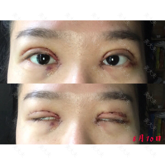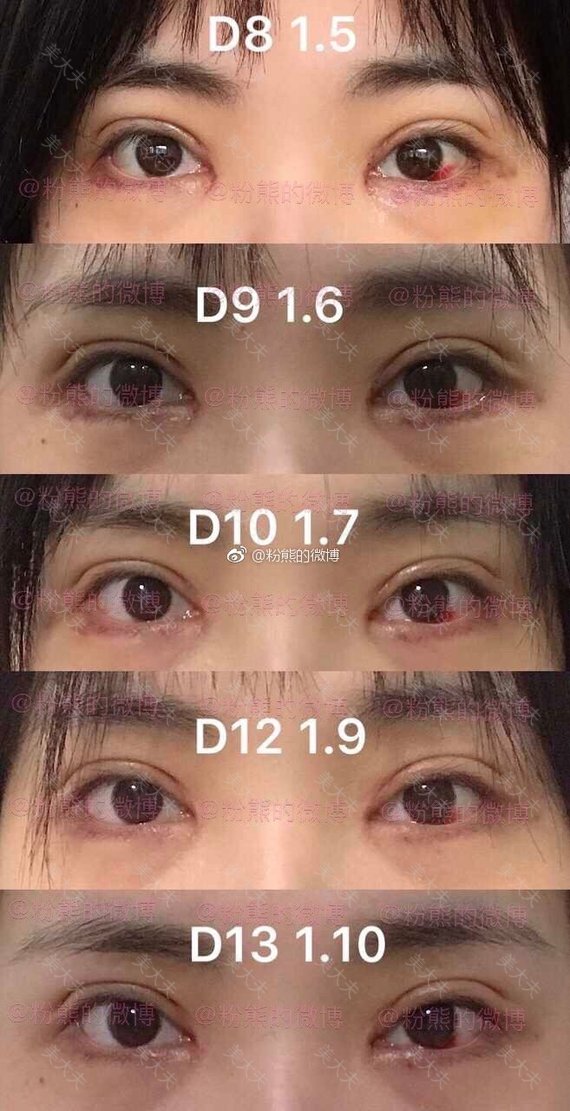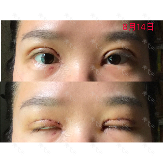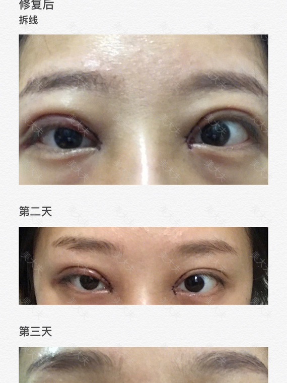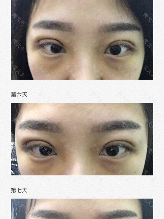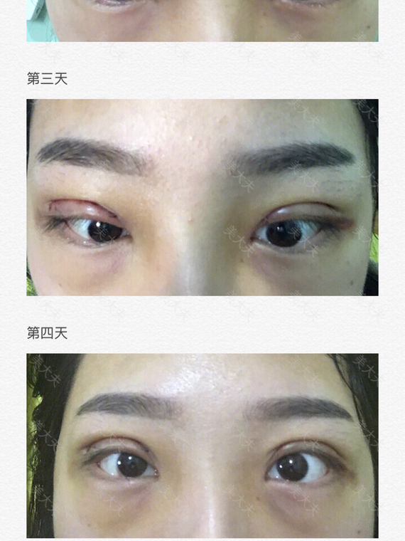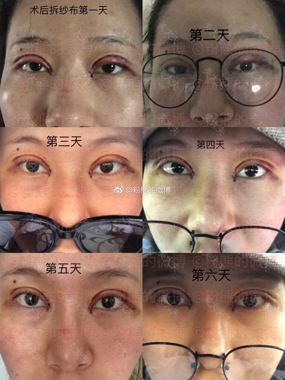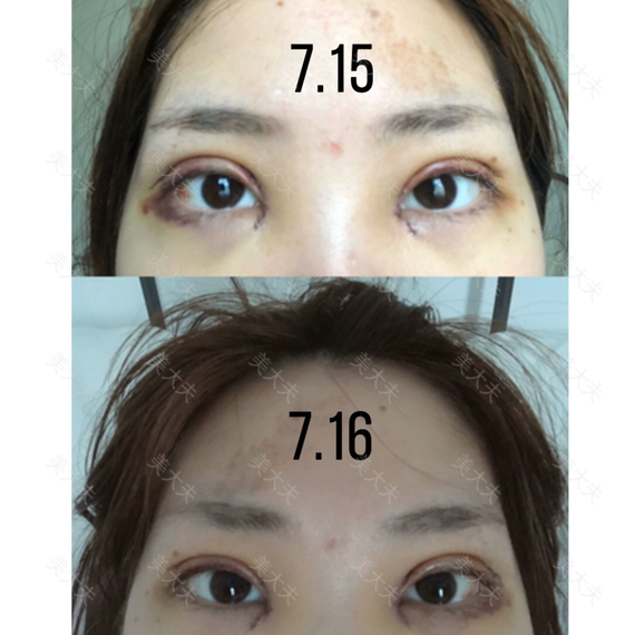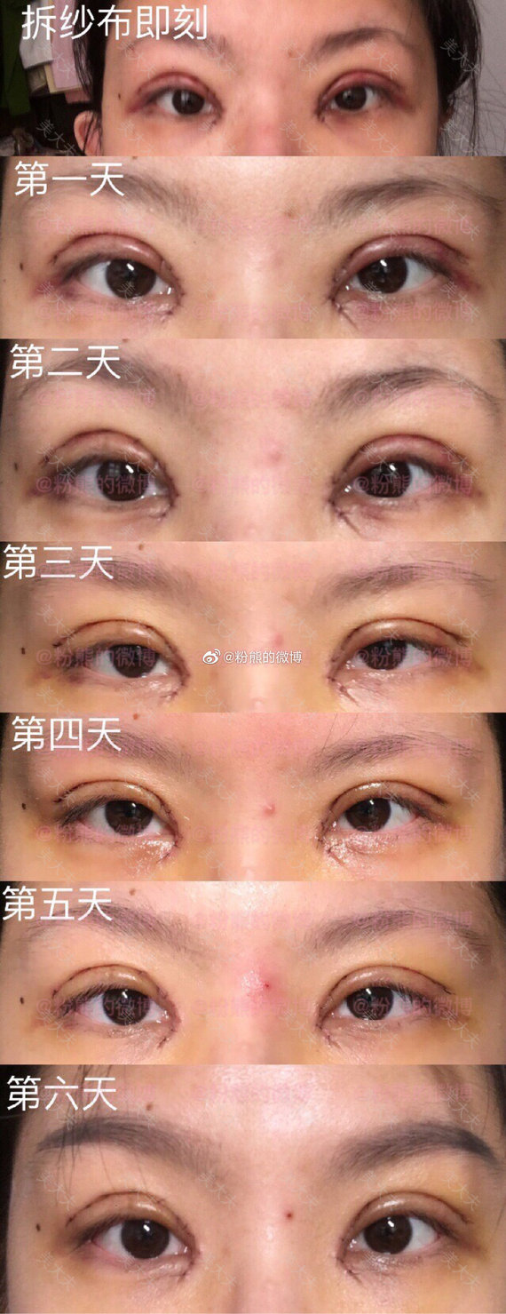 术后,谨遵医嘱,冰敷三天。我常常困倦无比就睡着了,可能身体自身恢复的需要吧。第二天早上拆纱布,只有轻微的淤血,情况非常好。第三天会轻微水肿些,尤其是早上。第四天就好很多了,除了不能笑,不能有表情,因为面部肌肉会牵扯到疼。另外冰敷时要注意冰袋外包上干净的纱布,因为冰箱内有大量细菌。平时用眼药水冲洗眼睛,用棉签擦干净分泌物,消脱止按时服用。周六拆线时,已经和平时无大异样了。期间有任何问题,黄医生或助理都会及时详细的一予以回复,非常靠谱。