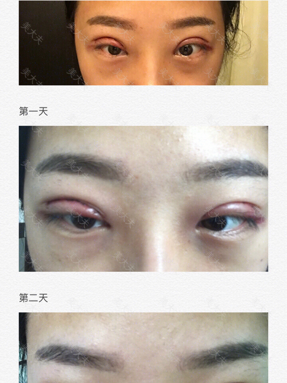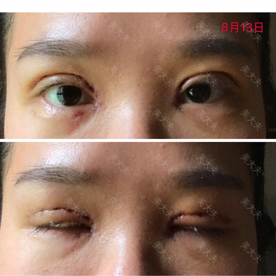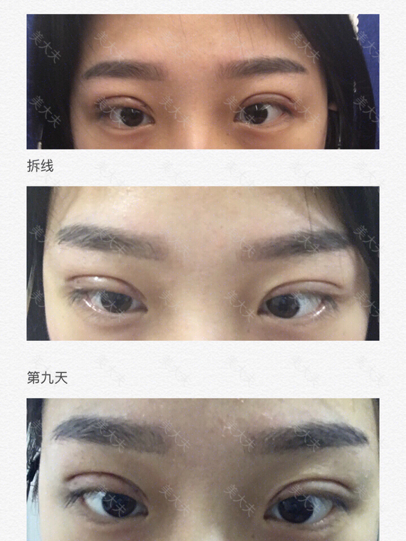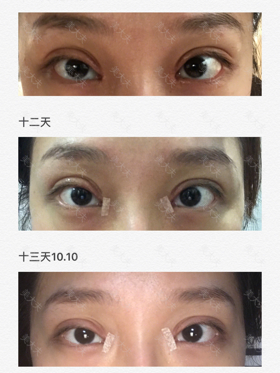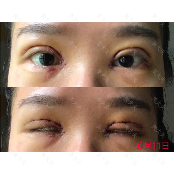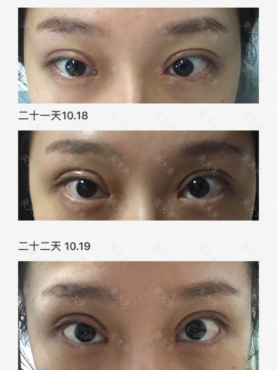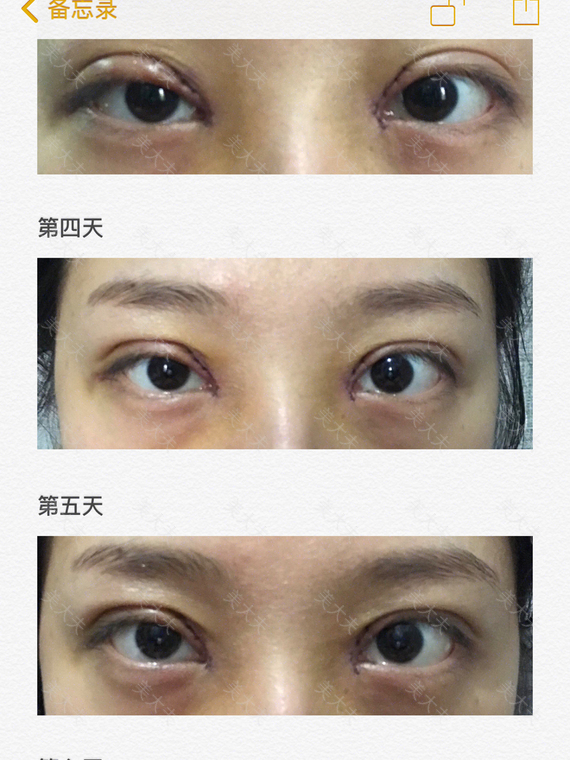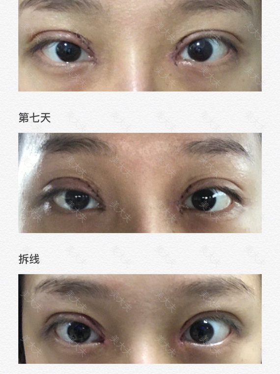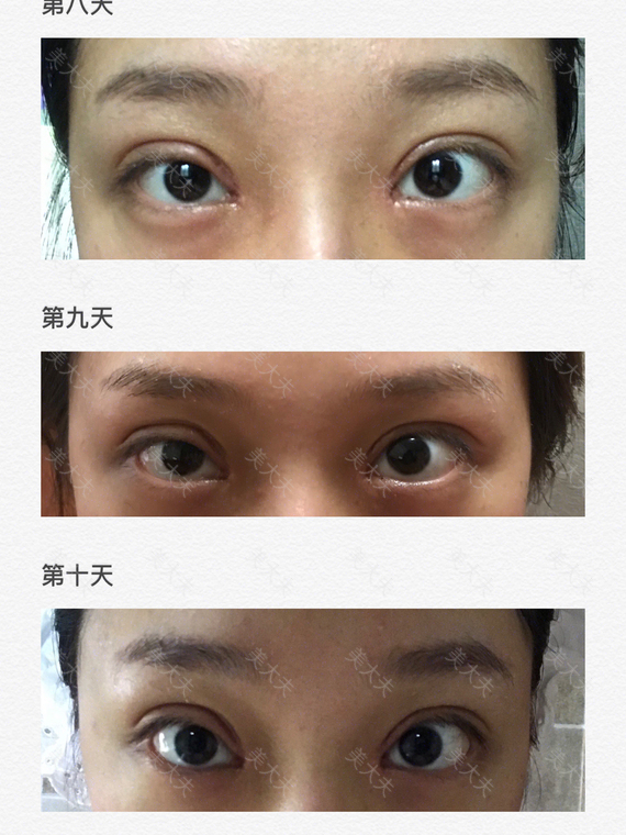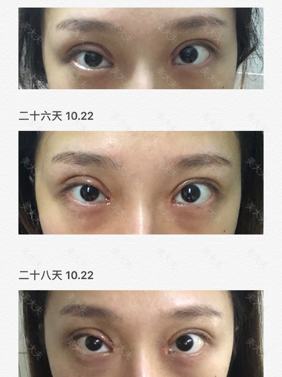 术后,谨遵医嘱,冰敷三天。我常常困倦无比就睡着了,可能身体自身恢复的需要吧。第二天早上拆纱布,只有轻微的淤血,情况非常好。第三天会轻微水肿些,尤其是早上。第四天就好很多了,除了不能笑,不能有表情,因为面部肌肉会牵扯到疼。另外冰敷时要注意冰袋外包上干净的纱布,因为冰箱内有大量细菌。平时用眼药水冲洗眼睛,用棉签擦干净分泌物,消脱止按时服用。周六拆线时,已经和平时无大异样了。期间有任何问题,黄医生或助理都会及时详细的一予以回复,非常靠谱。
