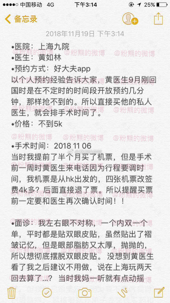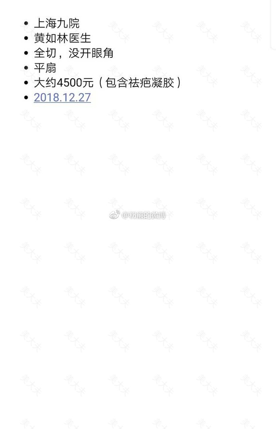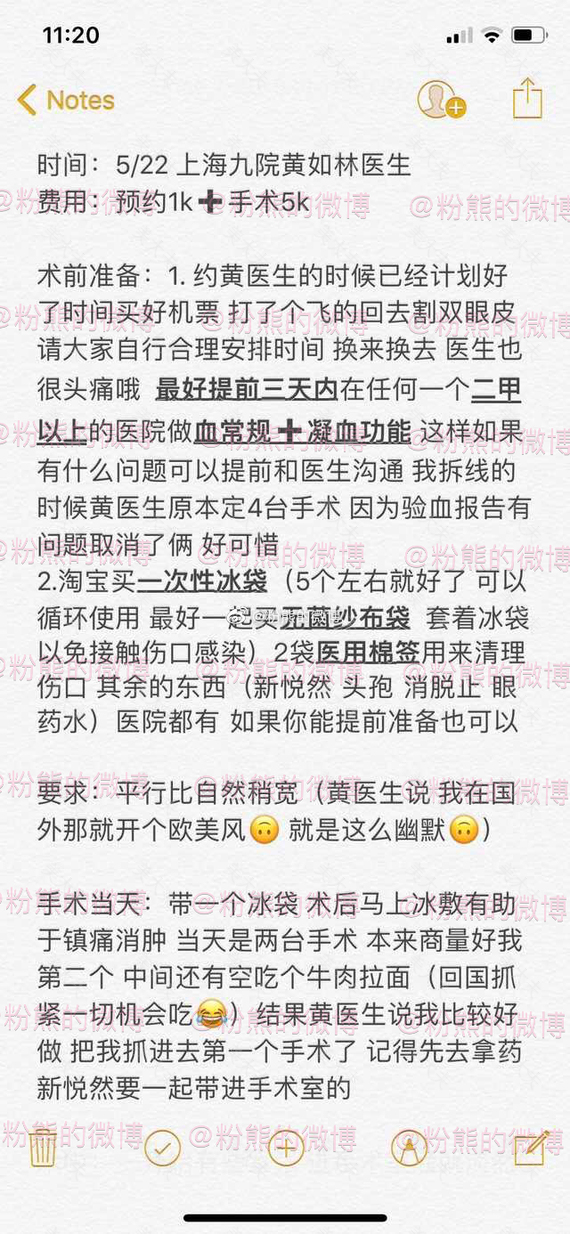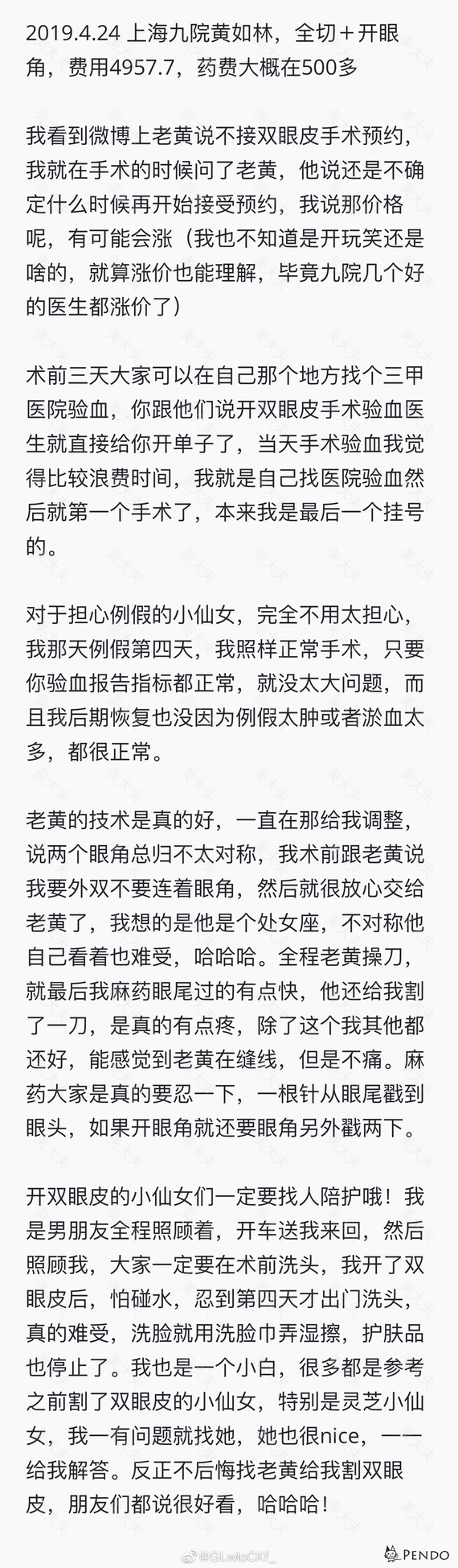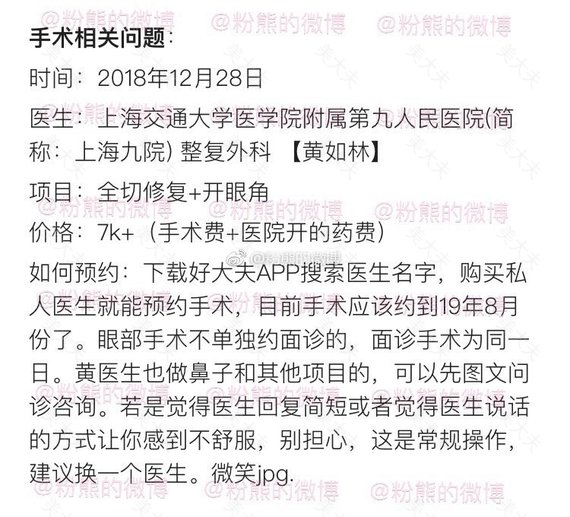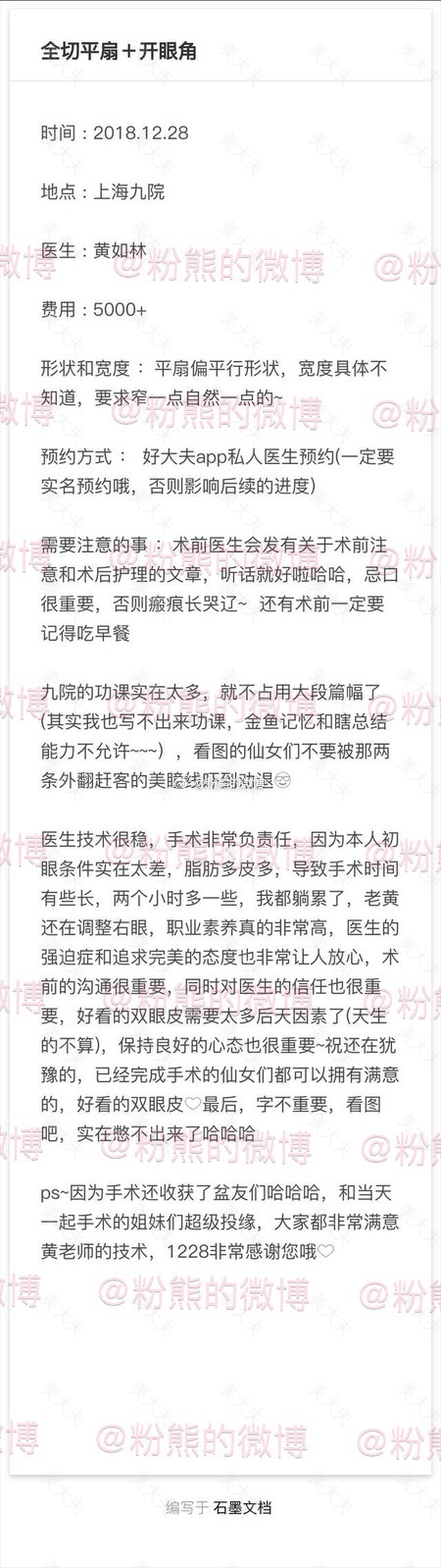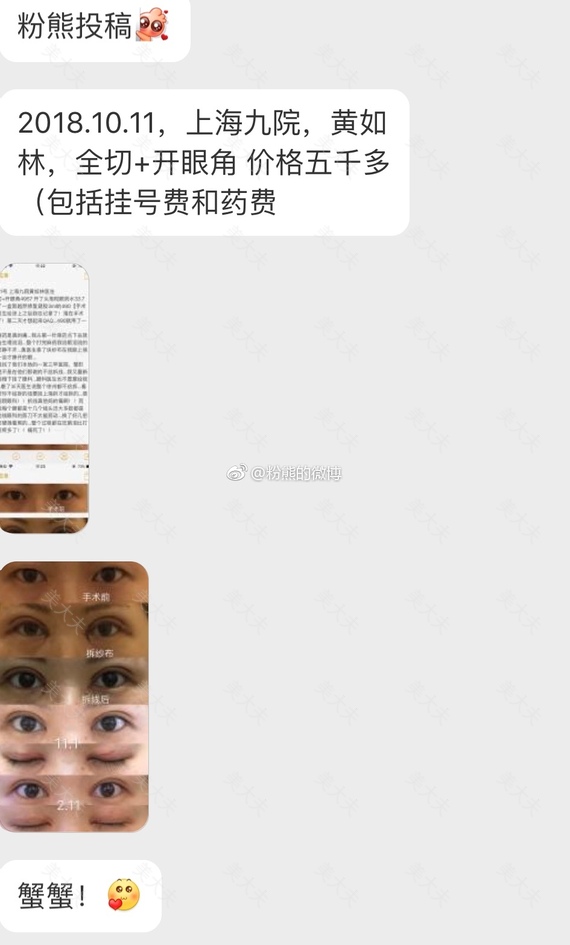 粉熊的微博一双眼皮投稿2018.11.6,上海九院,黄如林,全切➕开眼角,价格5k。