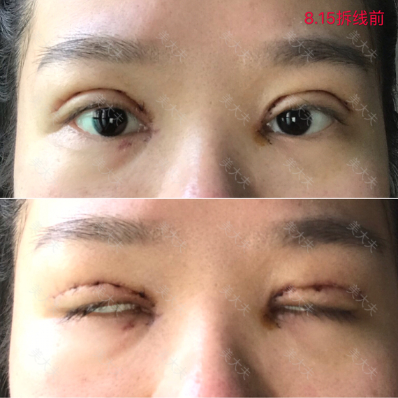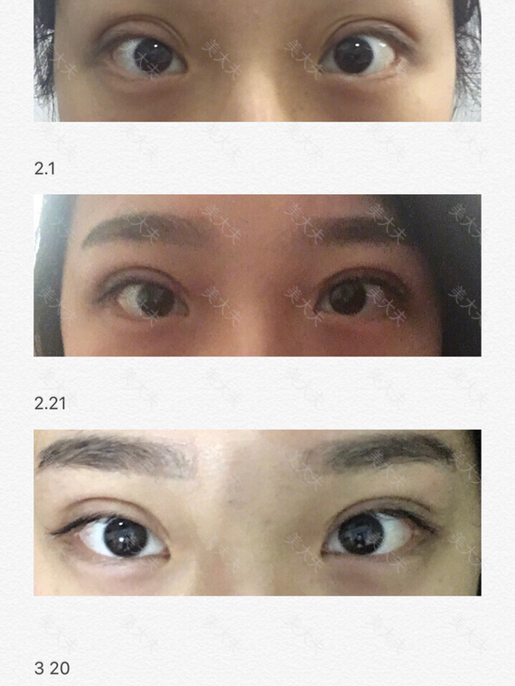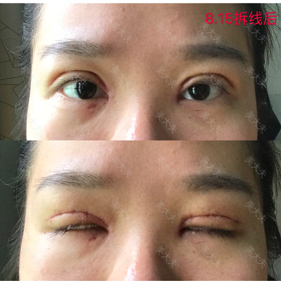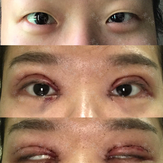 手术做完下午回家后,眼睛就开始肿了,第二天自己把纱布拆了,眼睛肿的厉害用手按按稍微有一点点痛感。这之后,我每天遵医嘱用冰袋敷2到3次,第三天开始一点点慢慢消肿了。术后一周回去拆线,我以为会很痛,结果瞬间拆完,一点都不痛。我又找黄医生请他看看拆线后的情况,医生说效果很好。还给拍了照片。嘱咐每天2-3次抹凝胶,之后眼睛消肿了,就是双眼皮有些发黑发麻。我微信咨询黄医生,他都予以解释。随着时间的延续,症状开始慢慢减轻。现在手术已经两个月了,我恢复的特别好,之前的朋友邻居们见了我都以为我做了双眼皮手术,眼睛大了,人也精神了!
