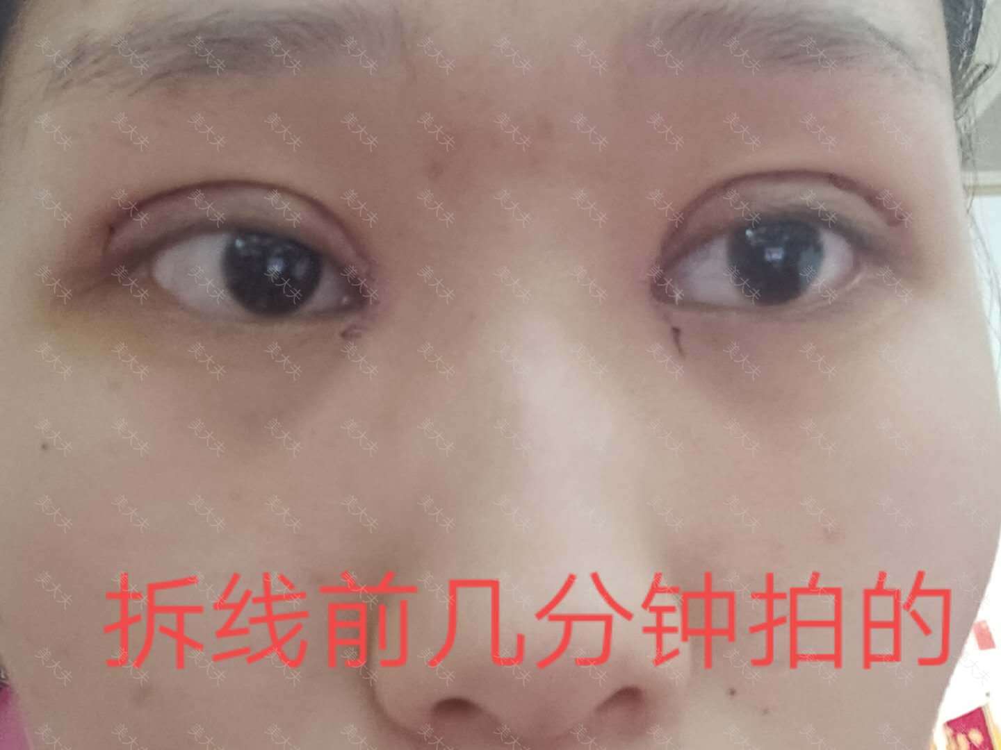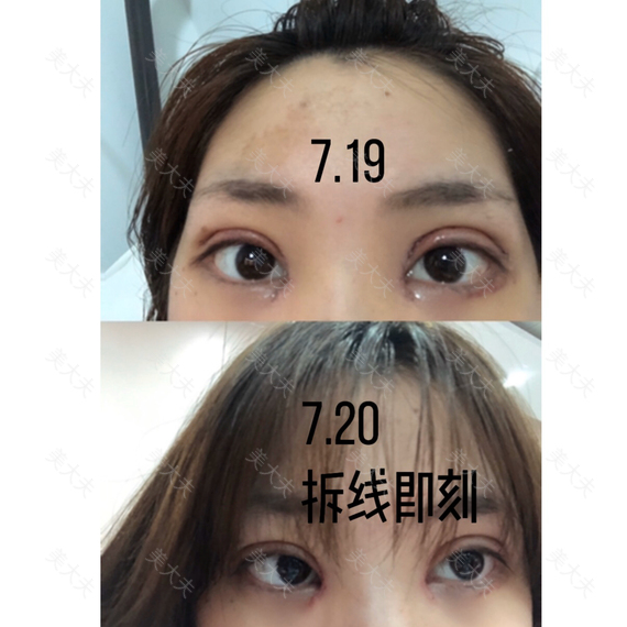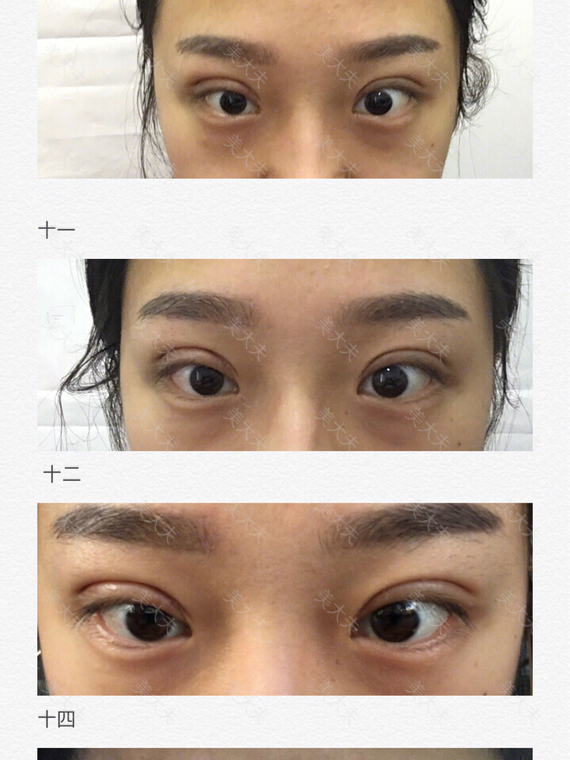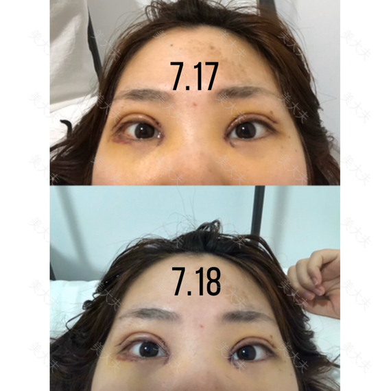 术后,谨遵医嘱,冰敷三天。我常常困倦无比就睡着了,可能身体自身恢复的需要吧。第二天早上拆纱布,只有轻微的淤血,情况非常好。第三天,会轻微水肿些,尤其是早上。第四天肿就好很多了,除了不能笑不能有表情,因为面部肌肉会被牵扯到会疼。另外,冰敷时要注意冰袋外包上干净的纱布,因为冰箱内有大量细菌。 平时用眼药水时不时冲洗眼睛,用棉签搽干净分泌物,消脱止按时服用。周六拆线时,已经可以和平时异样了。中间,有任何问题,黄医生或助理都会及时详细地一一予以答复,非常靠谱。