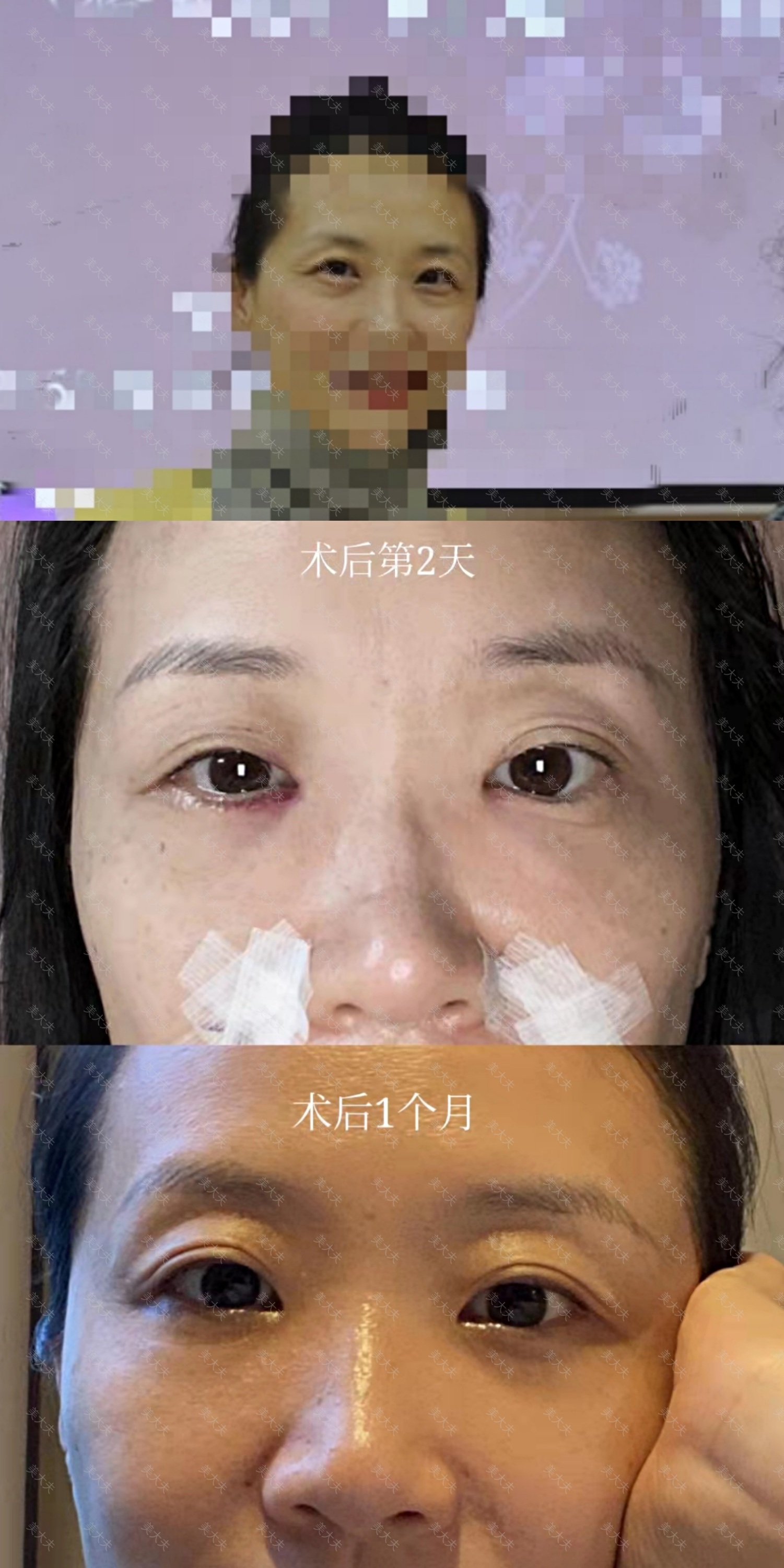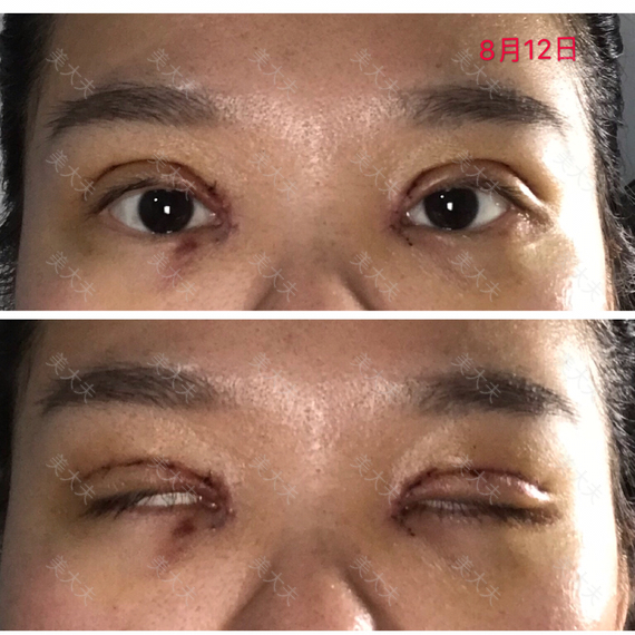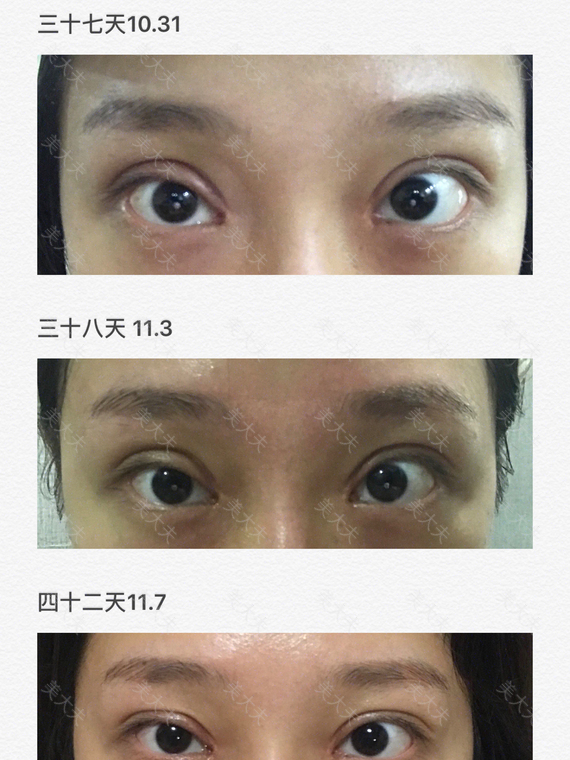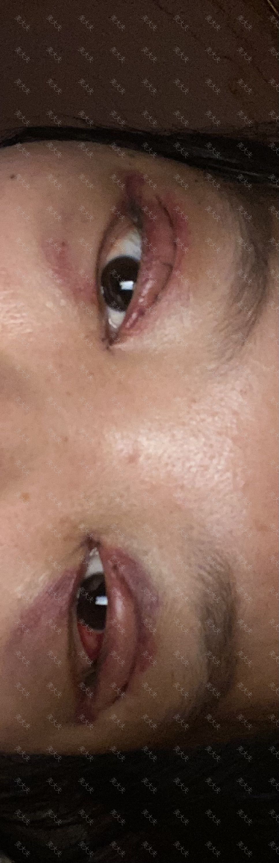 术后效果:术后反应较大,我当天出血较多,第二天拆纱布,上面都是血,眼睛不怎么睁得开,眼球有淤血,眼周淤血也严重,不过形状很好看,恢复时间较慢。但形状很好看的,后期恢复有点不对称,因为我右眼自己形成了一道褶子,所以更宽了一点,在我的接受范围内,因为恢复也看个人情况的。现在一个月多,虽然还是肿,但我很满意,我觉得很漂亮,不多说了,上图。图片就是恢复过程,苹果原相机拍摄,最后一张美颜相机。