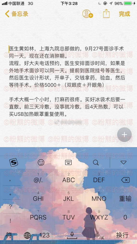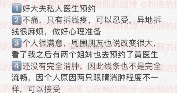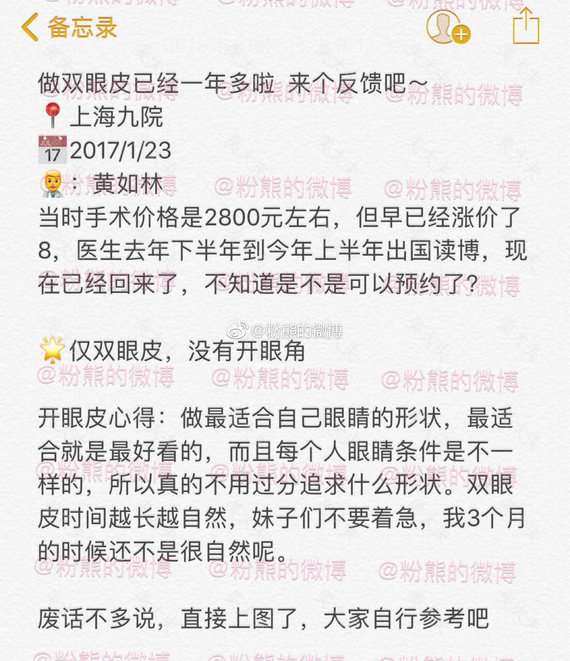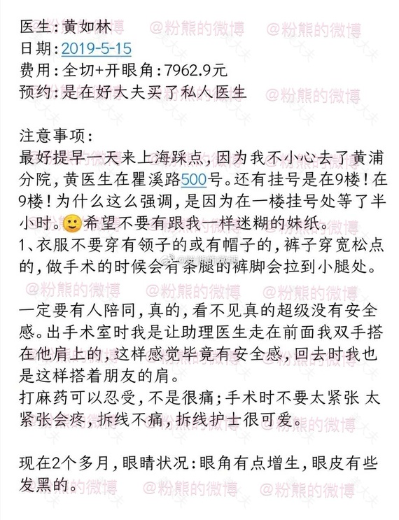 粉熊的微博一双眼皮投稿 医生黄如林,上海九院总部做的,9月27号面诊手术同一天,价格5000+(双眼皮+开眼角)