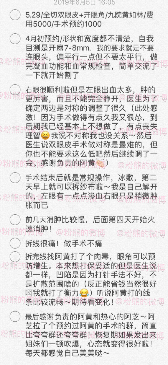 粉熊的微博一双眼皮投稿2018.12.28,上海九院 ,黄如林医生 ,全切+开眼角,5000 。#微博投稿一一双眼皮#