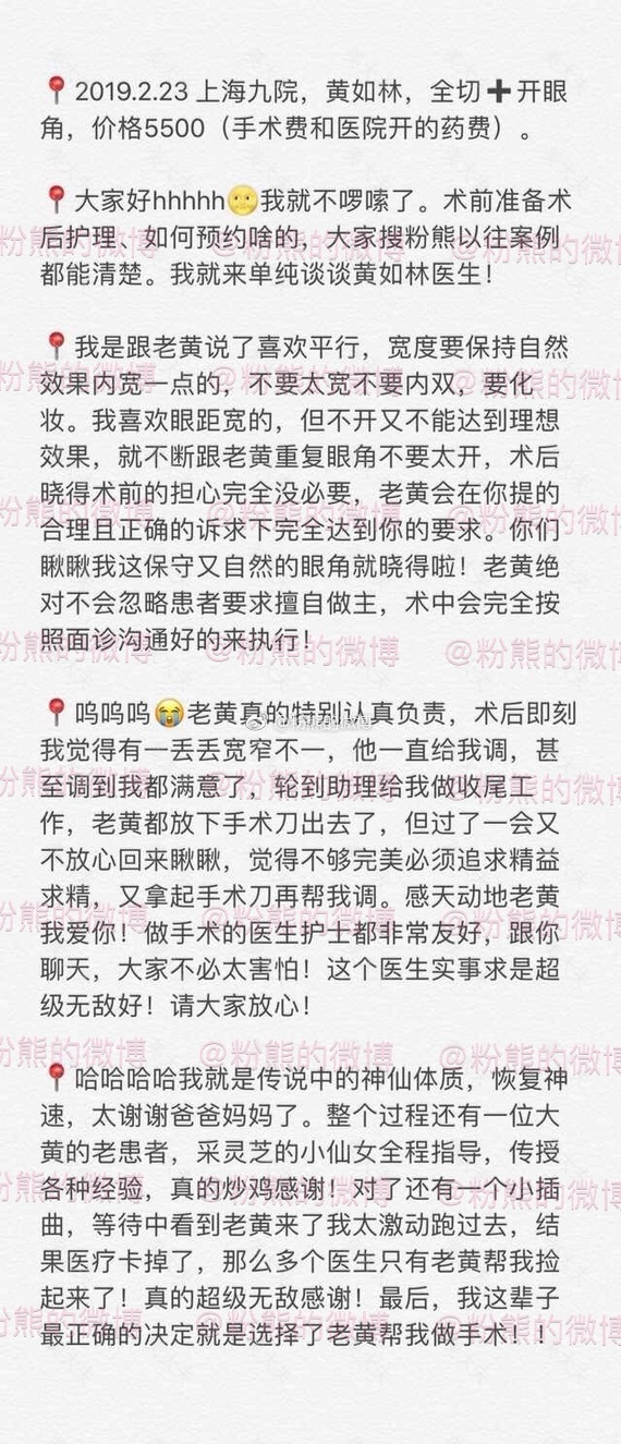 粉熊的微博一双眼皮投稿2019.2.23,上海九院,黄如林,全切+开眼角,价格5500,我这辈子最正确的决定就是找老黄帮我做手术#微博投稿一一双眼皮#