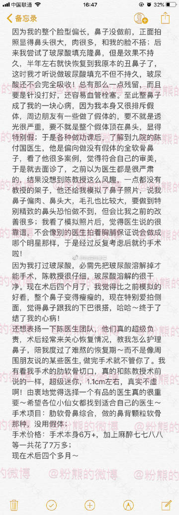 其实我说一句陈付国还挺可的,看了他修的整友鼻子,我觉得挺可的,但是也是十几万修的。她术前是被我骂过的某个医托爱带的名医做到鼻翼塌陷,现在挺好的,替她感谢下。