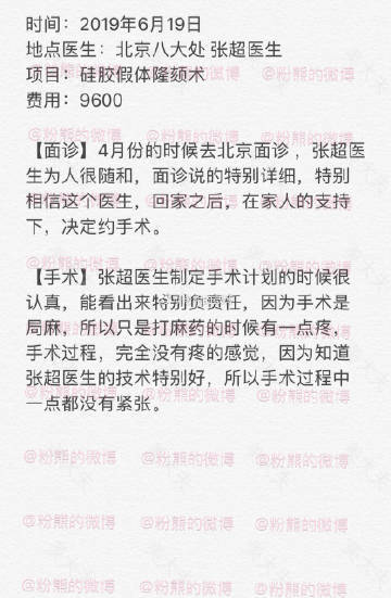 #粉熊的微博一下巴投稿#2019年6月19日,北京八大处,张超医生,国产硅胶假体隆颏术,费用9600。