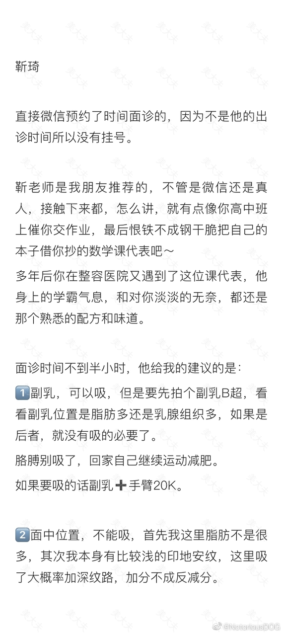 进去以后有助理在边上 沟通时间不算太多 我提的要求基本都是能做 价格涨过一轮了 我是二吸三个部位3w 这个价格在八大处面吸里面真的不便宜 不过还是会考虑他毕竟二次会想选个一次到位的 目前在他和靳琦之间纠结