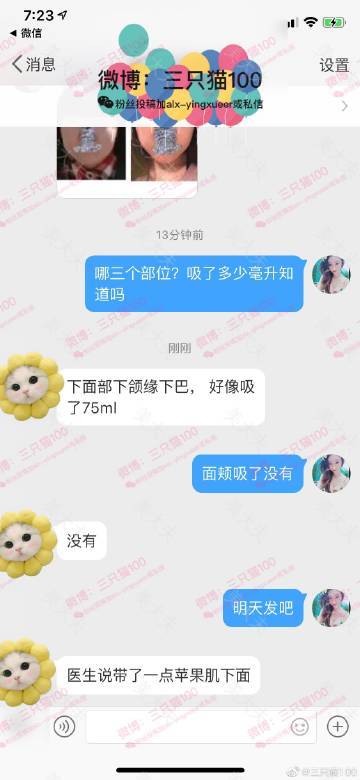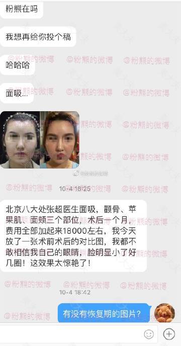 #粉熊的微博一吸脂投稿#5月27日,北京八大处,张超,面部吸脂,脸颊,双下巴,1万7左右。