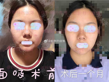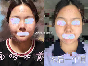 面吸两个月啦,感觉手术很值得,吸的过程也不痛苦。好多姐妹问我局麻痛不痛,我觉得不痛。其实我的承痛能力算低,手术之前因为看了功课很多人说很痛什么的,所以还没开始做手术就吓得发抖,一直跟张超医生说轻点,还问他痛不痛,,,他诚恳的说肯定会痛。打麻药的时候他下手很轻,还一直安慰我,打进去发现真的不痛……就和打瘦脸针差不多感觉。但是需要打很多针麻药,而且还要打肿胀液。总体来说手术过程算轻松的,主要是张超很关心手术者,会一直安慰,减轻手术的紧张感。然后术后的改变,整体来说就是脸变紧了,我的吸脂部位是下颌缘,双下巴,面颊。感觉下面部还是小了一圈,但是不会有换头的变化,因为我做完身边也没人觉得变化特别大,但我自己觉得脸小了许多的。现在为止也没有出现凹凸不平或者下垂。左右大小脸也有很大的改变。恢复期也比较短,一个星期见人完全没问题。总体来说我认为面吸手术对于做了轮廓或者脸上脂肪多的人是十分有效的,也非常庆幸自己选对了医生,但是姐妹们不要对一项手术抱有过大的期待,整容路任重道远,认真做功课,耐心变美。图一是对比,图二 三是术后,没修但是马赛克有点重。面吸以后感觉有一边颧骨好像没推进去,不过手术没有百分百的对称也没啥纠结的啦。