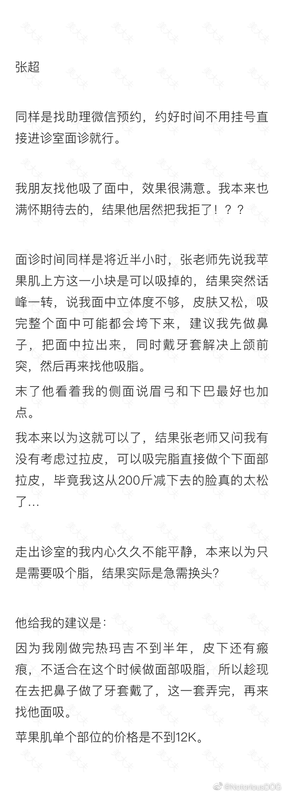 八大处张超,有个挺爽朗的助理,每个月出诊两次,其余都是查房早晨面诊,要预约。一个做轮廓的医生,免不了要给人面吸的,找他的有只想面吸的,也有做了轮廓后脸垂下来需要面吸的,所以临床经验应该还算丰富。人很谦和,说话比较保守,面诊比较细心,就是手术排期都是几个月之后了,着急面吸的恐怕要等一阵子,网上案例不多,但审美还可以,也跟被吸过的网上沟通过,评价也不错,算中规中矩,但是颧弓和苹果肌也是被他拒绝面吸的。