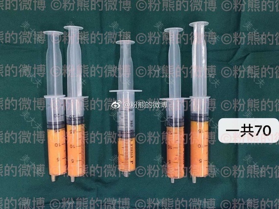 上述两个步骤后,就是在耳垂下方开始进行吸脂了。你就能听到摩擦和插针进来的声音,然后没弄完一管,旁边小助理就会收集你的脂肪到大针管里面。