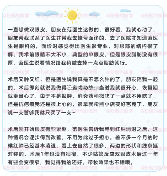 手术当天真的其实也蛮紧张的,可是范医生真的很温柔,先给 我模拟了一下我想要的双眼皮形状,然后就开始了手术。手术 进行了2个小时,术中范医生一直再给我不断的调整,让我起 来给我看,真的超级尽责的哦!术中打麻药和去脂是真的有点 疼,可是术后看见自己的双眼皮也很欣慰了。割完之后有点肿 ,前三天真的很肿,可是后面就越来越自然了,现在看着我的 双眼皮我都好开心,朋友都夸我变好看好多,眼睛大了好多, 之前被压在眼皮下面的睫毛也都露了出来。现在术后2周了, 我感觉我的眼睛越来越好看了,越来越自然了,因为我很认真 的忌口,伤口恢复的比较快也比较好,很久没见过的朋友居然 都没看出来我割了双眼皮,就是觉得很自然很好看,眼睛也有 神多了,果然我的选择没有错,我要为范医生疯狂打CALL!