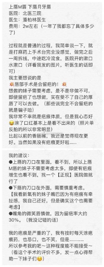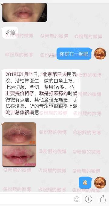 #粉熊的微博一唇部投稿#2018年1月11日,北京第三人民医院,潘柏林医生,做的口角上扬,上唇切薄,全切,费用1w多。